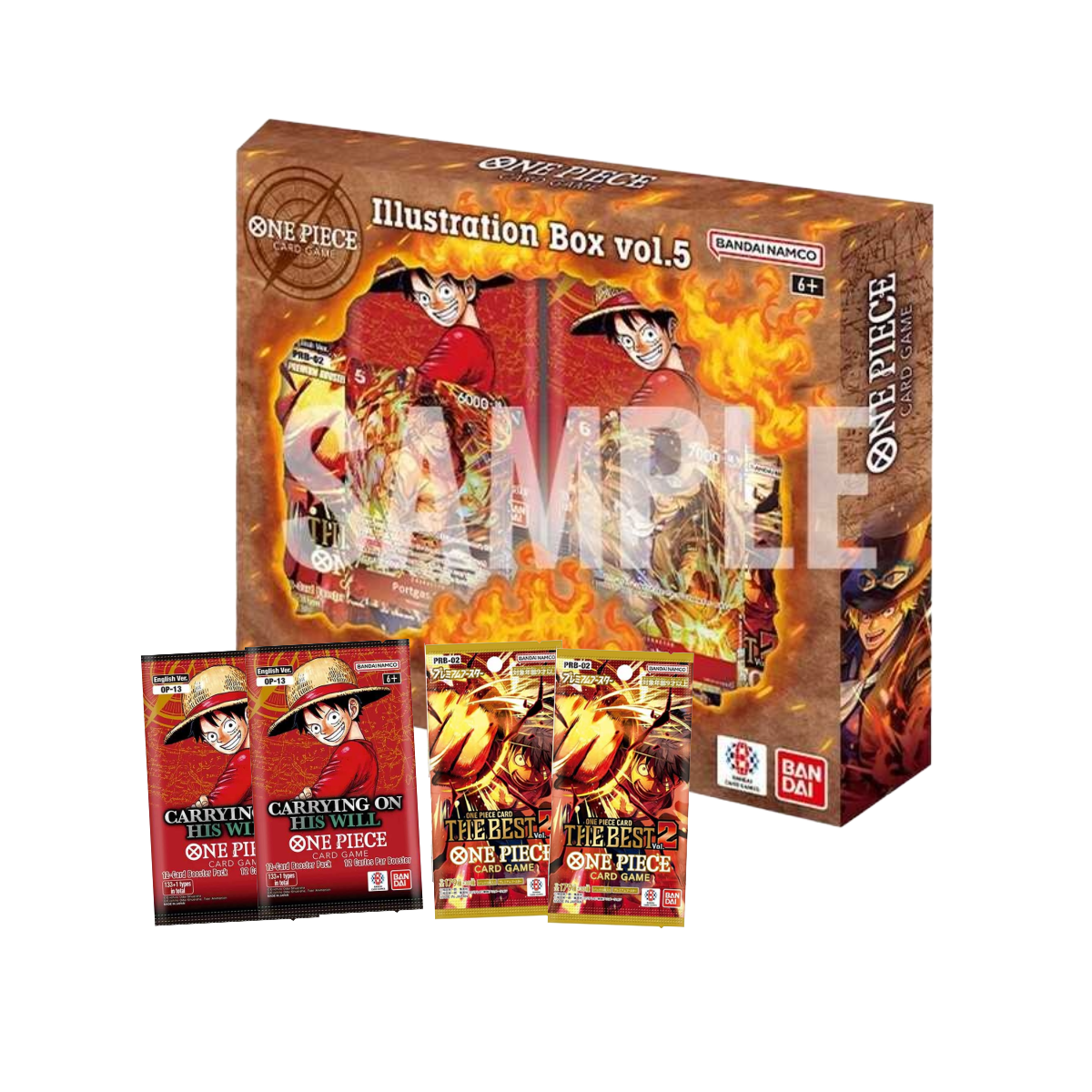 De IB-05 illustration box bevat twee booster packs van OP-13 Carrying on His Will en twee booster packs van PRB-02 The Best Vol.2 en twee promo kaarten dat exclusief is voor deze editie.