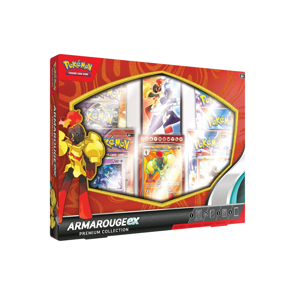 In deze box vind je drie prachtige promo kaarten. Een foil-etched Armarouge EX en twee foil promo kaarten van Charcadet en Ceruledge! Deze premium collection box komt bovendien inclusief zes Pokémon boosters, 65 kaarthoesjes met opdruk van Armarouge en Ceruledge en een magnetische kaarthouder om je mooiste kaart in te bewaren, inclusief standaard.