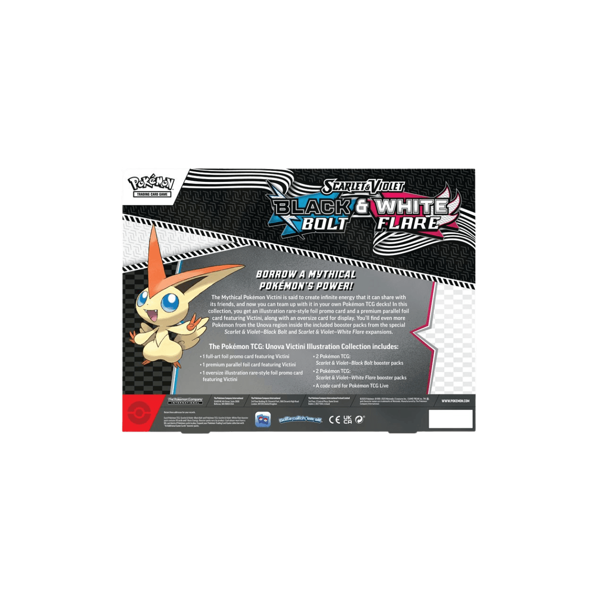 Leen de kracht van het mythische Pokemon Victini! Deze exclusieve Illustration Collection bevat een illustration rare-style foil promo kaart van Victini, een premium parallel foil kaart, een oversize display kaart, 2 Black Bolt booster packs, 2 White Flare booster packs en een TCG Live code. Het mythische Pokemon Victini creert oneindige energie die het kan delen met vrienden – nu ook in jouw Pokemon TCG decks!