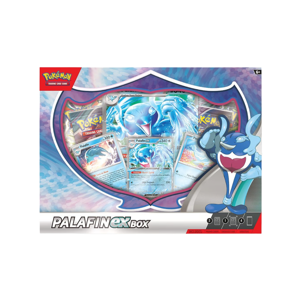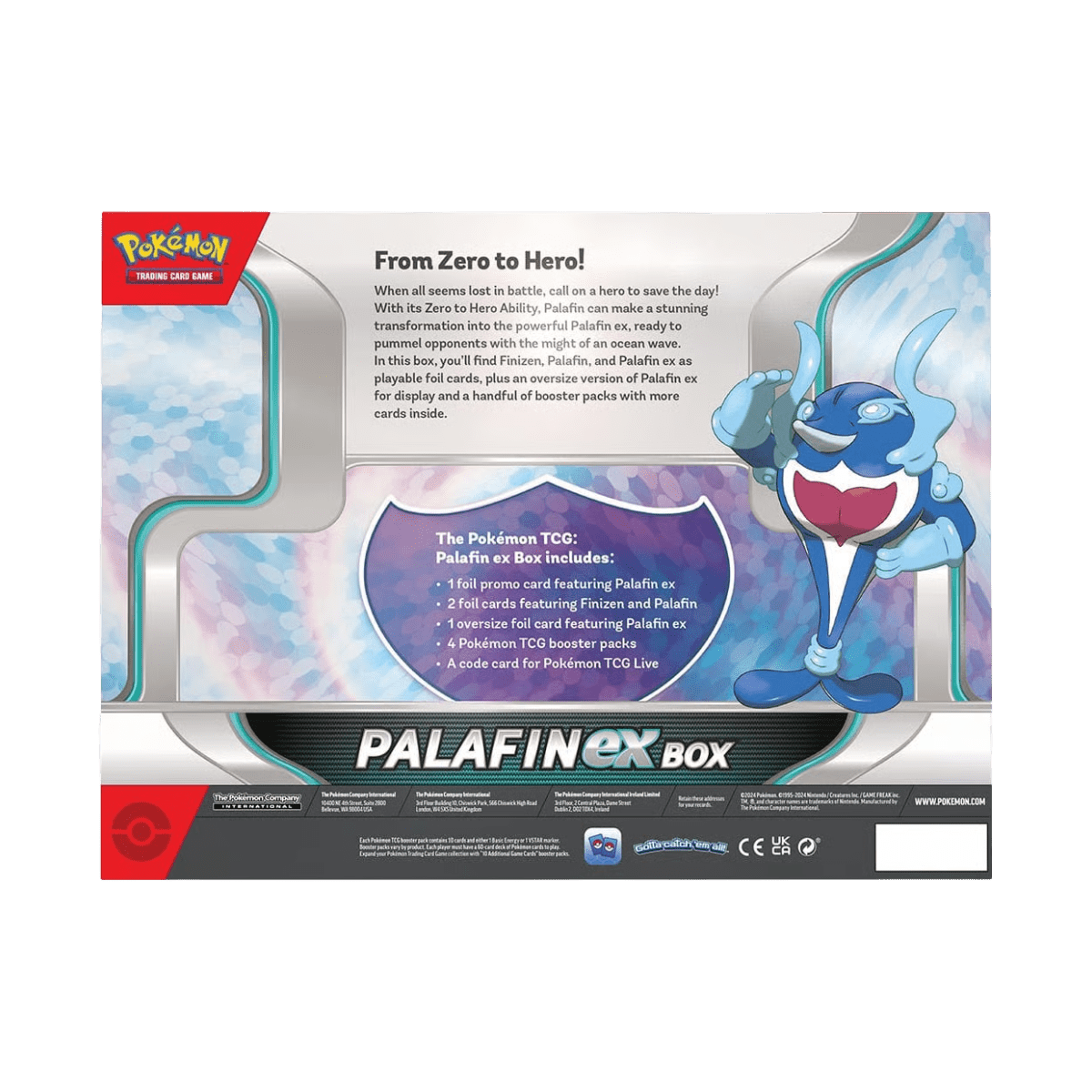 In deze box vind je vier prachtige foil Pokémon promo kaarten. Een foil Palafin EX, een foil oversized Palafin EX, een foil Palafin en een foil Finizin! Bovendien bevat deze box vier willekeurige Pokémon booster packs.