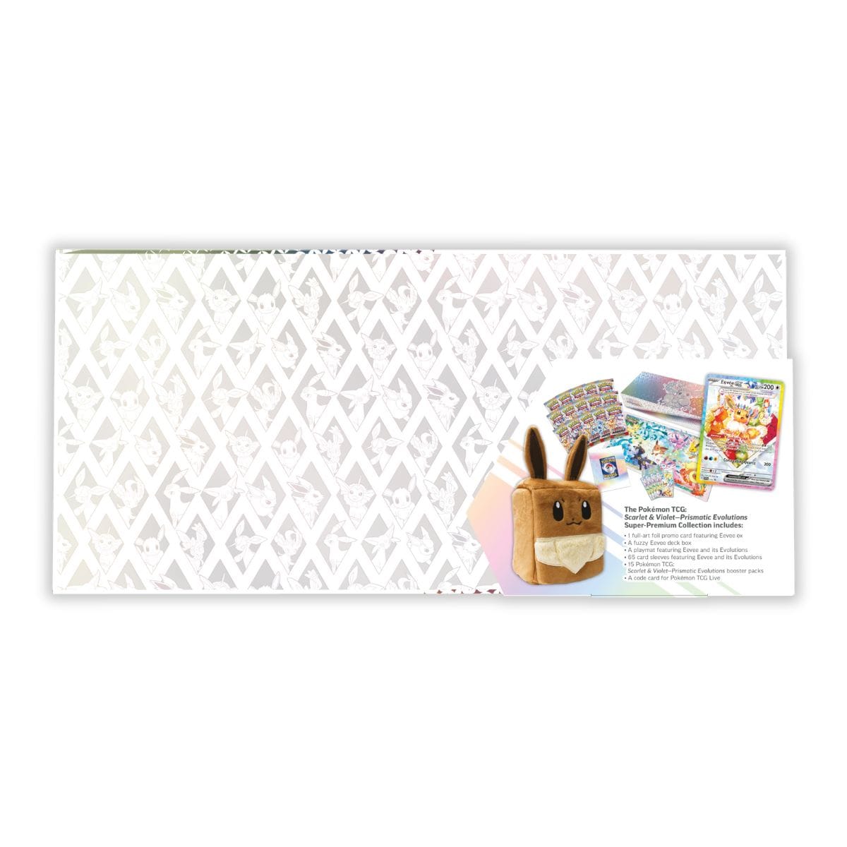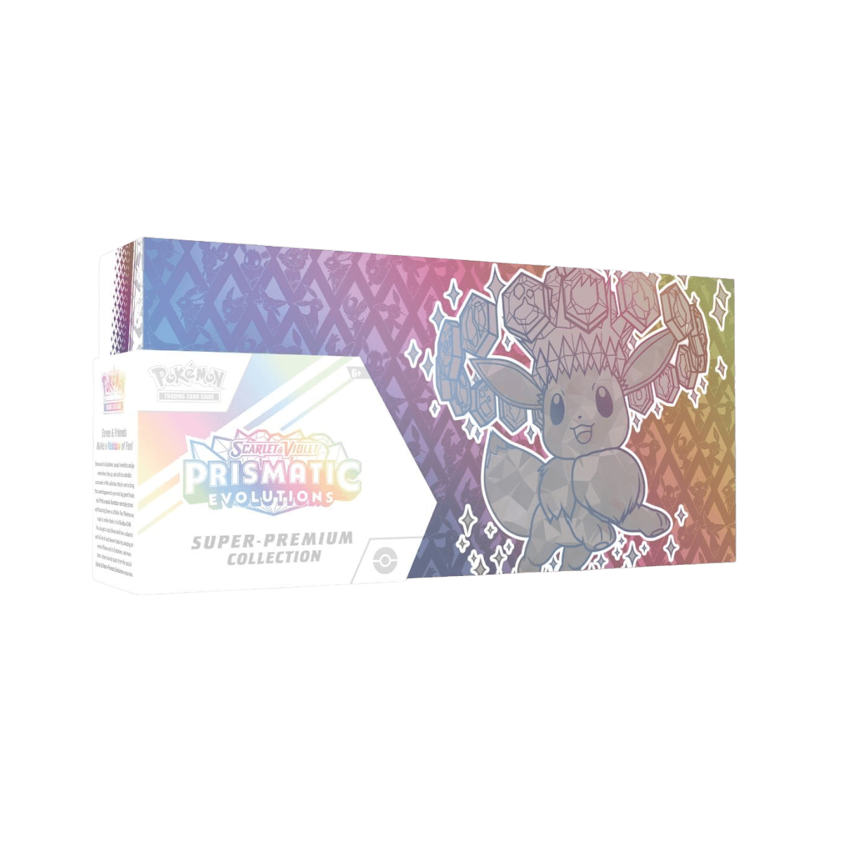 Pokémon Prismatic Evolutions – Super Premium Collection Deze Super Premium Collection zit bomvol Pokémon magie! Ontdek een prachtige Eevee ex promo kaart, een unieke playmat met alle Eeveelutions, 65 kaarthoesjes, een zachte Eevee deckbox én 15 Prismatic Evolutions boosterpacks. Alles verpakt in een schitterende verzameldoos met Pokémon artwork.