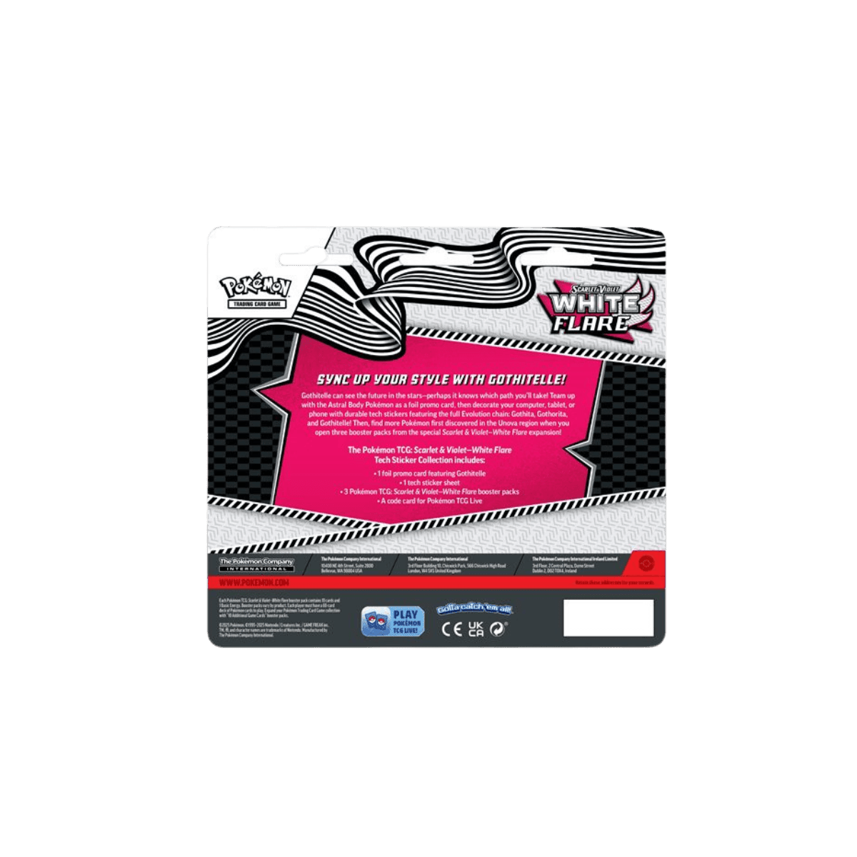 Personaliseer je tech apparaten met Gothitelle! Deze Pokemon TCG White Flare Tech Sticker Collection bevat een foil promo kaart van Gothitelle, duurzame tech stickers van de complete evolutielijn (Gothita, Gothorita, Gothitelle), 3 White Flare booster packs en een TCG Live code. Het Astral Body Pokemon Gothitelle kan de toekomst zien in de sterren – misschien voorspelt het jouw pad als Pokemon trainer!