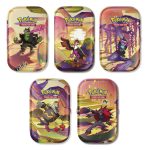 Een set van vijf verschillende Scarlet & Violet Shrouded Fable Mini Tins van Pokémon.