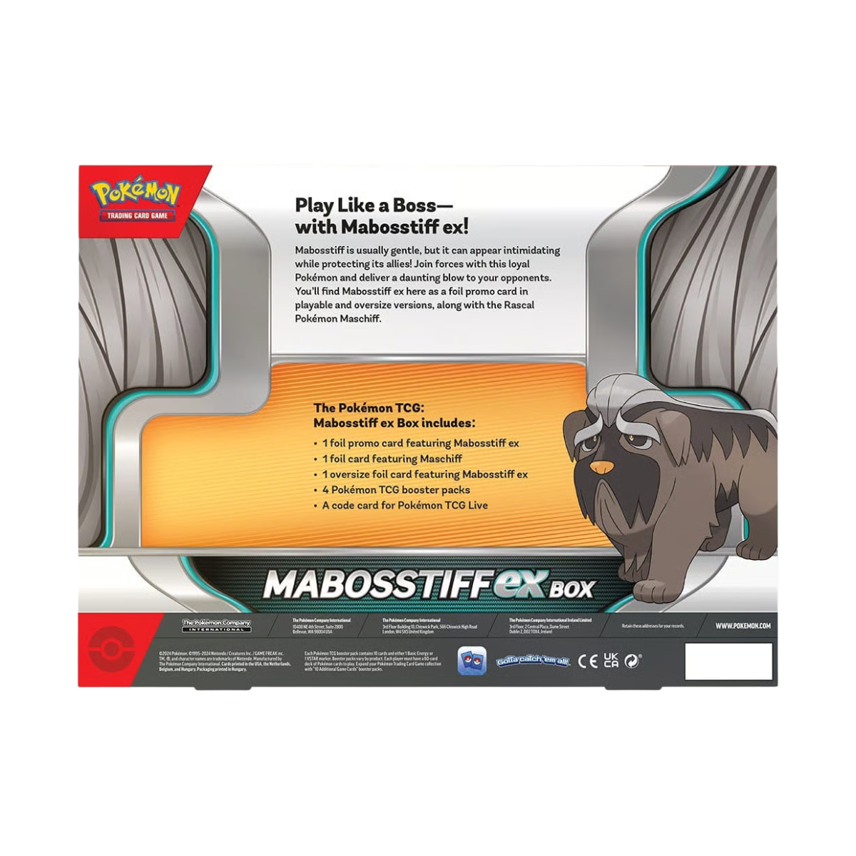 In deze box vind je drie prachtige foil Pokémon promo kaarten. Een foil Mabosstiff EX, een foil oversized Mabosstiff EX en een foil Maschiff! Bovendien bevat deze box vier willekeurige Pokémon booster packs.