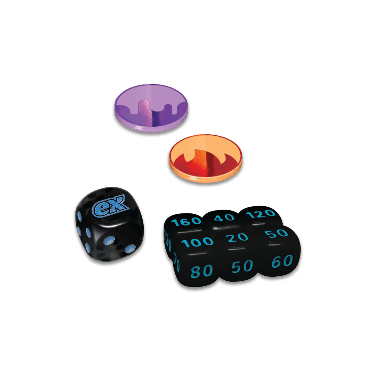 - Competitieve dobbelstenen, statusmarkers en een munt