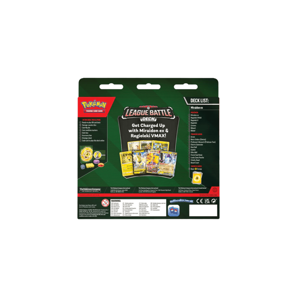 Laad je op met snelheid en precisie dankzij het Miraidon ex League Battle Deck! Dit kant-en-klare 60-kaarten deck is samengesteld voor serieuze Trainers en competitieve Pokémon TCG-spelers. Met krachtige kaarten zoals Miraidon ex en Regieleki VMAX kun je direct meedoen op hoog niveau — zowel thuis aan tafel als online via Pokémon TCG Live.